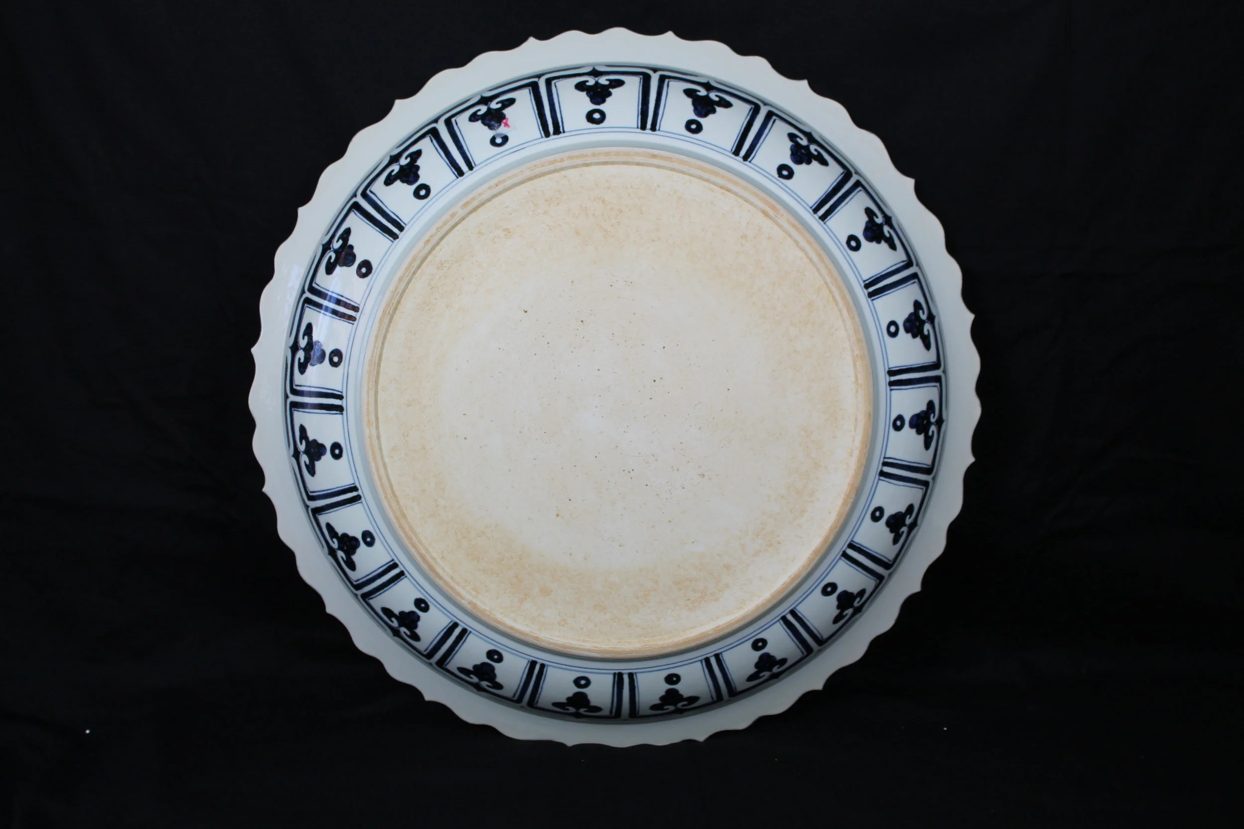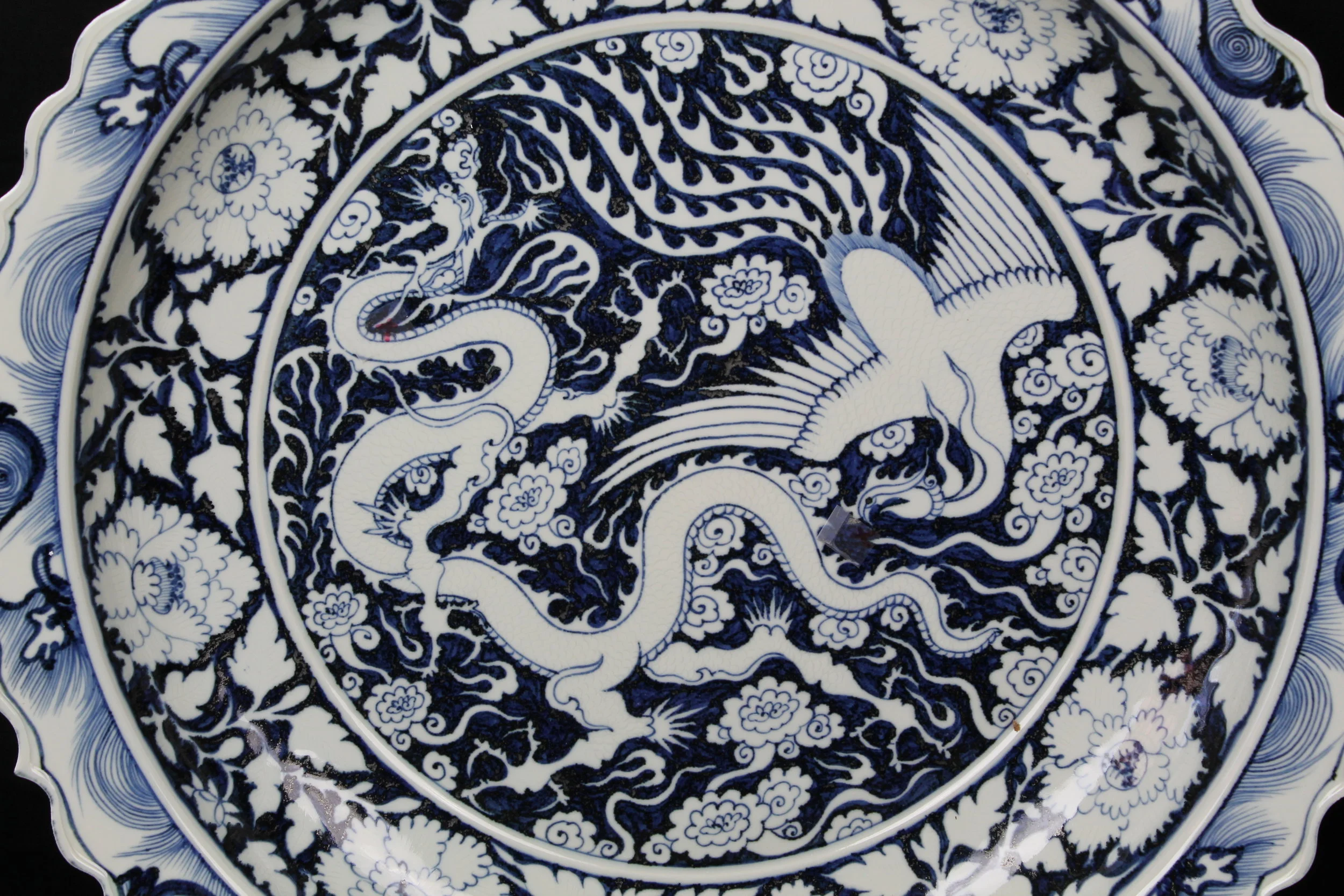 此藏品特色:棱边大盘,青花湮灭,釉中有气泡,有浓重的锡斑。龙躯细长,且细颈,细腿、细爪和尖尾巴。