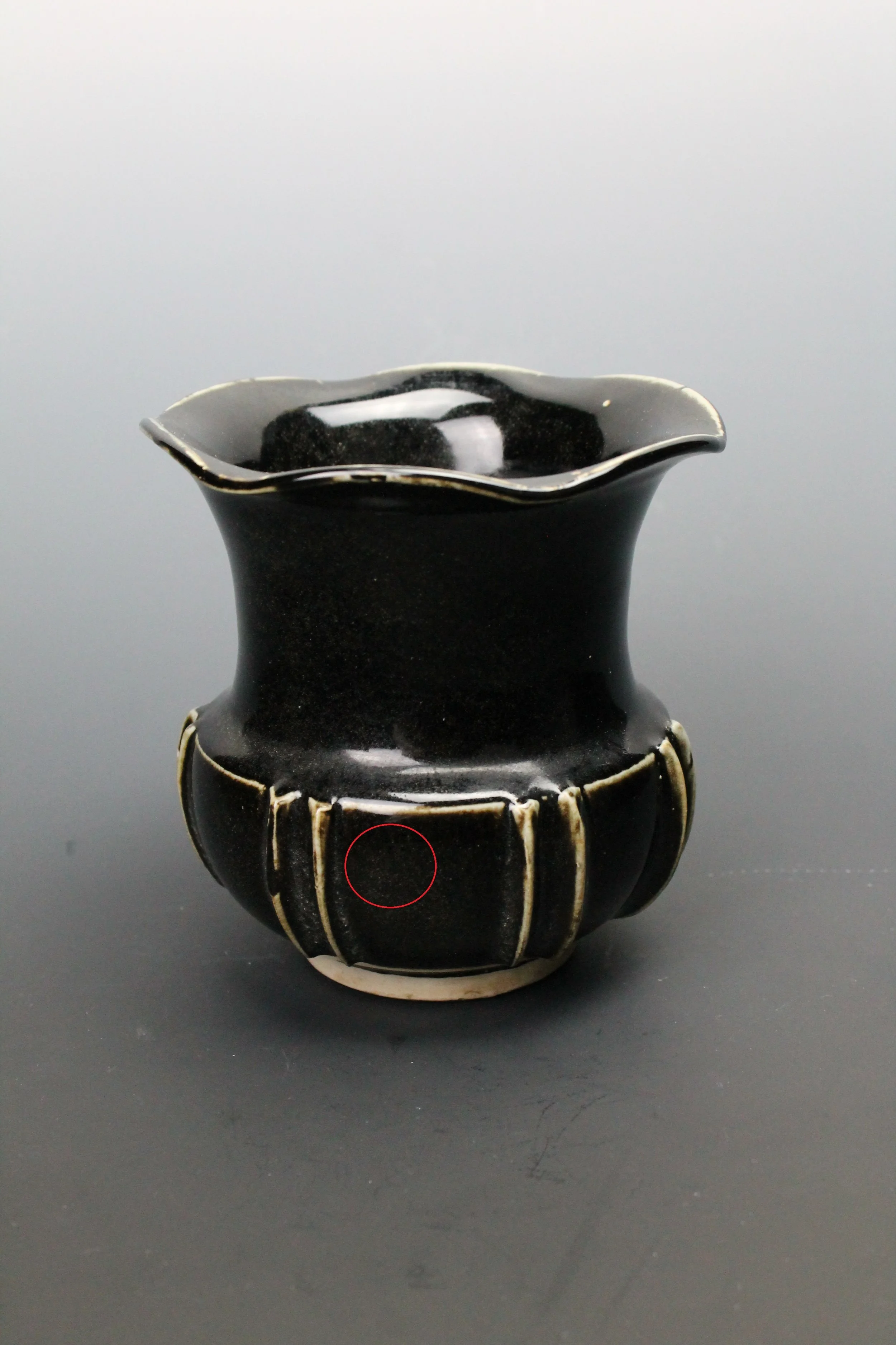 此藏品特色:定窑黑釉花口口斗,花口,束颈,下垂腹,腹下渐收,圈足。
